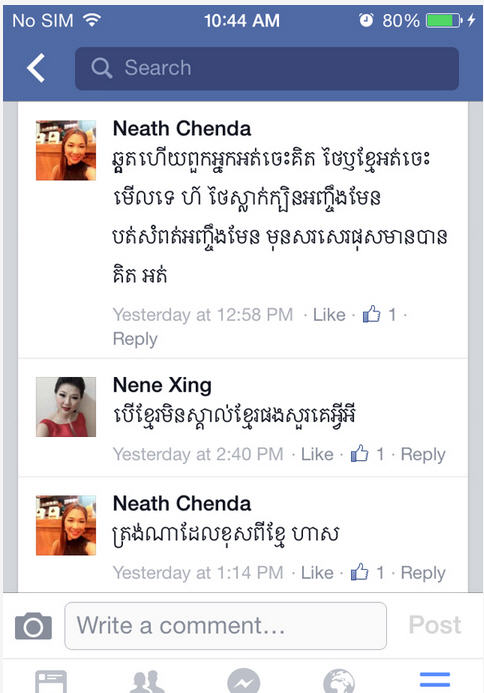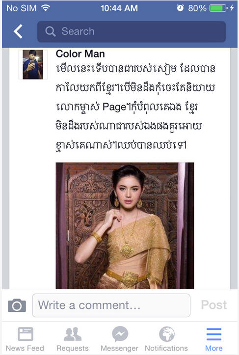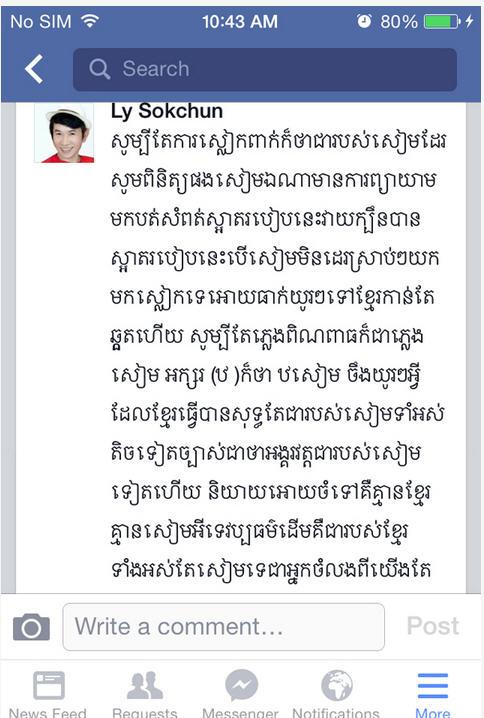 លោកបន្តថា រវាងថៃហ្នឹងពិបាកក្នុងការបែងចែង វប្បធម៌ណាស់ ព្រោះវាស្រដៀងគ្នាតែបើរចនាបទខ្មែរសំពតគឺ បត់ស្អាតត្រឹមត្រូវ មិនមែនដេរស្រាប់ៗដូចថៃទេ ហើយស្បៃយើងក៏មានលក្ខណៈស្អាតជាងដែរ ។ អ្វីដែលសំខាន់ខោអាវនេះ មិនមែនខោអាវដែលទិញពីថៃ ដូចសំអាងការមួយចំនួន គឺធ្វើនៅខ្មែរពិត ៗវាពិតជាស្នាដៃពិតរបស់កូនខ្មែរ ហេតុដូច្នេះមុនពេលរិះគន់គួរណាស់ តែស្វែងពីសំលៀកបំពាក់ របស់គេ និងខ្មែរឲ្យចាស់ជាមុនសិន ៕