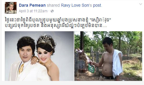 នំពេញ៖អស់រយៈពេល១ឆ្នាំហើយ ដែលតារាសម្តែង និងជាតារាចម្រៀងអ្នកនាង សឿ សុធារ៉ា បានបាត់បង់បងប្រុស ជាទីស្រឡាញ់គឺលោក សឿ រ៉ាវុធ ដោយនាងបានរំលេចសារខូចចិត្ត រៀបរាប់ពីអារម្មណ៍ផ្ទាល់ខ្លួន បង្ហាញជាសាធារណៈ នៅលើ Facebook ។
