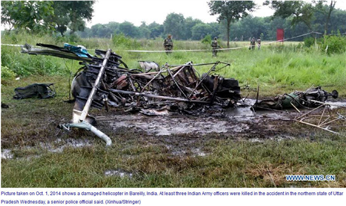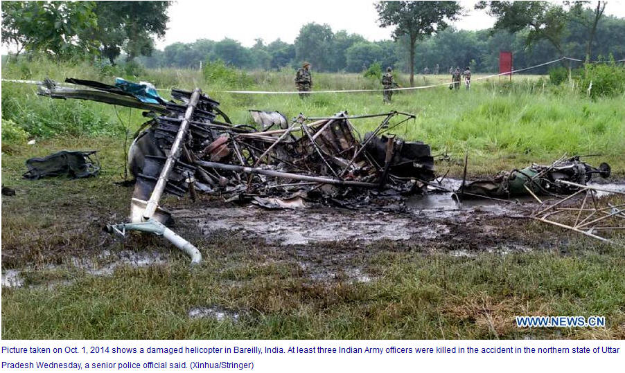 ព័ត៌មានអន្តរជាតិ ៖ ក្រោយពីបានដកស្រង់ សម្តីមន្រ្តីជាន់ខ្ពស់ ទំព័រសារព័ត៌មានបរទេស រដ្ឋចិន ស៊ិនហួរ បានចេញផ្សាយ អត្ថបទព័ត៌មានអោយដឹងថា យ៉ាងហោចណាស់ មន្រ្តីយោធា ៣ រូប បាន ស្លាប់បាត់បង់ ជីវិត ក្នុងហេតុការណ៍ គ្រោះថ្នាក់ ធ្លាក់ឧទ្ធម្ភាគចក្រ នៅថ្ងៃពុធនេះ នៅឯភាគខាងជើង រដ្ឋ Uttar Pradesh