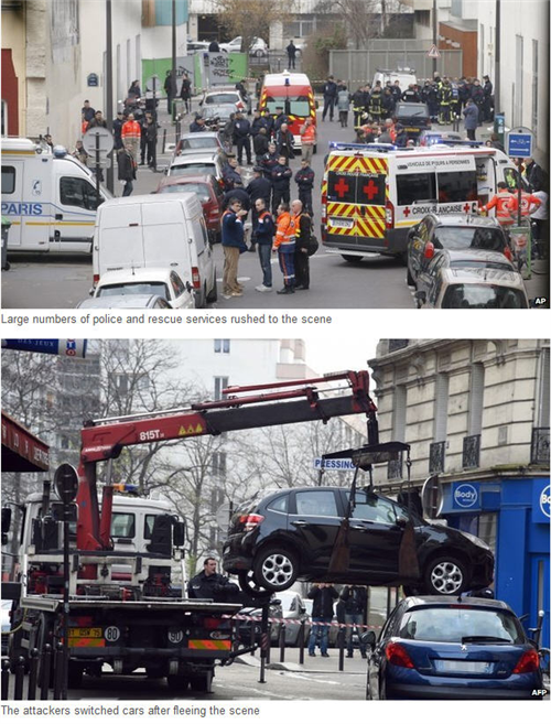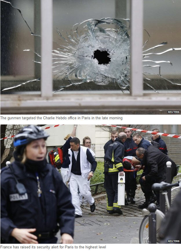 ព័ត៌មានអន្តរជាតិ ៖ ទីភ្នាក់ងារព័ត៌មានចិនស៊ិនហួ បានចេញផ្សាយនៅព្រលប់ថ្ងៃទី០៧ ខែមករា ឆ្នាំ ២០១៥នេះថា មានការបាញ់ប្រហារដ៏ខ្លាំងក្លាមួយទៅលើ ទីស្នាក់ការកាសែត របស់បារាំង នៅក្នុងទី ក្រុង ប៉ារីស បណ្តាលឲ្យ មនុស្ស ១២នាក់ បានស្លាប់បាត់បង់ជីវិត និងមួយចំនួនទៀត បានរងរបួស។