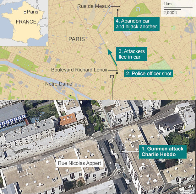 គួររំឭកថា យោងតាមការចេញផ្សាយរបស់ព័ត៌មានបារាំង បានឲ្យដឹងថា ខ្នាន់កាំភ្លើងមានគ្នាពីរនាក់ ពាក់ម៉ាសបិទមុខជិត បានជិះរថយន្តប្រដាប់ដោយ កាំភ្លើងយន្ត ហើយមកបាញ់រះលើទី ស្នាក់ការកា សែត ហើយក៏ជិះរថយន្តគេចខ្លួន ដោយសុវត្ថិភាពតែម្តង។