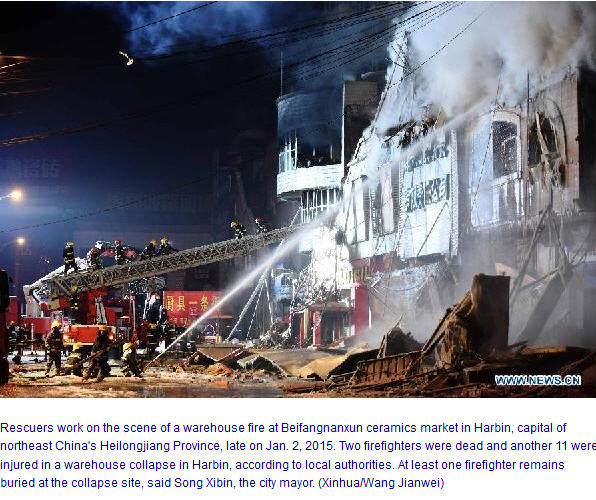 ព័ត៌មានអន្តរជាតិ ៖ ក្រុមការងារ ពន្លត់អគ្គីភ័យ ២ នាក់បានស្លាប់បាត់បង់ជីវិត ខណៈ ១១ នាក់ ផ្សេងៗ ទៀត របួសធ្ងន់ ស្រាល ក្រោយមានករណី បាក់រលំ ឃ្លាំងមួយកន្លែង ក្នុងទីក្រុង Harbin ខេត្ត Heilong- jiang ភាគខាងកើតឆៀងខាងជើង ប្រទេសចិន នេះបើយោងតាមការគូសបញ្ជាក់អោយដឹងពី អាជ្ញាធរ ក្នុងស្រុក ។