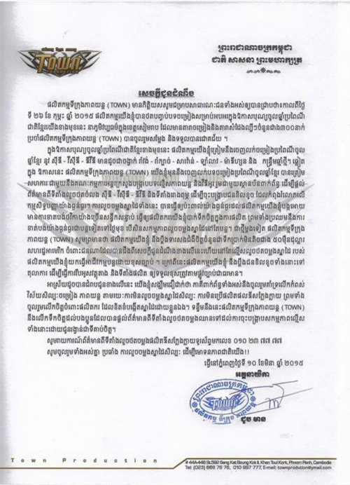 សេចក្តីប្រកាស បានរៀបរាប់ទៀតថា ការលួចចម្លងស្នាដៃទាំងនោះ បានធ្វើឲ្យប៉ះពាល់យ៉ាងធ្ងន់ធ្ងរ ដល់ផលិតកម្ម Town បង្កឲ្យមានការ ខាតបង់ថវិកា យ៉ាងច្រើនសន្ធឹកសន្ធាប់ និងធ្វើឲ្យផលិតករបាក់ទឹកចិត្ត ក្នុងការផលិត និងប្រឈម នឹងការខាតបង់យ៉ាងធ្ងន់ធ្ងរ ។ ដោយសារតែបែបនេះហើយ ទើបខាងផលិតកម្មសម្រេចចិត្ត ចេញសេចក្តីប្រកាសព្រមានថា នឹងប្តឹងទារសងជំងឺចិត្ត មិនតិចជាង៥០ម៉ឺនដុល្លារ ចំពោះជនណាដែលល្មើស លួចចម្លងស្នាដៃបទចម្រៀង របស់ផលិតកម្ម យកទៅធ្វើអាជីវកម្មបន្តដោយខុសច្បាប់៕