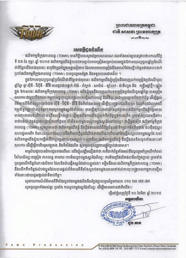 ភ្នំពេញ៖ ផលិតកម្ម Town បន្ទាប់ពីថតបញ្ចប់បទចម្រៀង សម្រាប់ត្រៀម អបអរក្នុងឱកាសបុណ្យចូលឆ្នាំ ប្រពៃណីខ្មែររួចមក មិនទាន់បាន ចេញលក់ ជាផ្លូវការផង ស្រាប់តែថ្មីៗនេះ ម្ចាស់ផលិតកម្មមួយនេះ បានចេញមុខព្រមានប្តឹងទារជំងឺចិត្ត ទៅលើជនណា ដែលលួចចម្លង ស្នាដៃបទចម្រៀងរបស់ខ្លួន លក់លើទីផ្សារខុសច្បាប់ ដោយក្នុងនោះផលិតកម្មនឹងប្ដឹងទារជំងឺចិត្តដល់ជនខិលខូចទាំងនោះ ប្រមាណជាង ៥០ម៉ឺនដុល្លារ ។