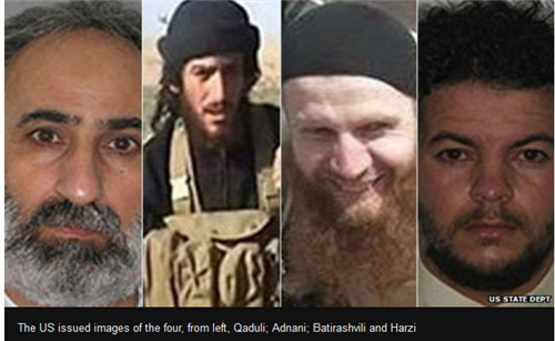 បណ្តាក្រុម មេដឹកនាំ ក្រុមឧទ្ទាមរដ្ឋអ៊ីស្លាមជ្រុល និយម IS ទាំង ៤ នាក់ជាប់ក្នុងបញ្ជីស្បែកខ្មៅស្រប ពេលអាមេរិក កំពុងតាមប្រមាញ់រកមុខ ដូច បូស នោះ មានឈ្មោះថា Abd al - Rahman Mustafa al-Qaduli; Abu Mohammed al-Adnani; Tarkhan Tayumurazovich Batirashvili និង Tariq Bin-al -Tahar Bin al Falih al-'Awni al-Harzi ។ សេចក្តីរាយការណ៍ បញ្ជាក់អោយដឹងថាពួកគេជាប់នៅក្នុង បញ្ជី នៃកម្មវិធីផ្តល់ប្រាក់រង្វាន់ របស់ក្រសួងយុត្តិធម៌ ។ អំឡុងថ្ងៃអង្គារ កន្លងទៅនេះ ក្រុមរដ្ឋអ៊ីស្លាម ជ្រុលនិយម IS អោយដឹងថា ខ្លួនជាអ្នកនៅពីក្រោយ ការវាយប្រហារ នៅ Texas សហរដ្ឋអាមេរិក ៕