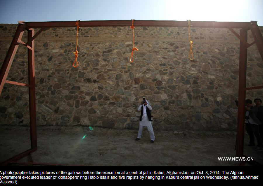 មេដឹកនាំក្រុមចាប់ជម្រិតដ៏សកម្ម មានឈ្មោះ Khalid និងឈ្មោះហៅក្រៅ Habib Istalif និងក្រុម ជនអន្ធ ពាល ៥ នាក់ផ្សេងទៀត ដែលបានធ្វើការចាប់រំលោភបូក ទៅលើជនរ ងគ្រោះ កាល ពី ពេលកន្លងទៅ នោះ ពួកគេទាំងអស់គ្នា ត្រូវបានរដ្ឋាភិបាល លេងចំណាត់ការណ៍ធម៌ក្តៅ ដោយ សម្រេចកាត់ទោសប្រ ហារជីវិត ព្យួរ ក នៅទីធ្លា គុក Pul-e-Charkhi កាលពីវេលាព្រឹក ថ្ងៃម្សិលមិញនេះបើយោងតាមសម្តីមន្រ្តី ម្នាក់សុំមិនបញ្ជេញឈ្មោះ ផ្តល់ជាកិច្ចសម្ភាសន៍ ដល់ភ្នាក់ងារ សារព័ត៌មាន ស៊ិនហួរ ។