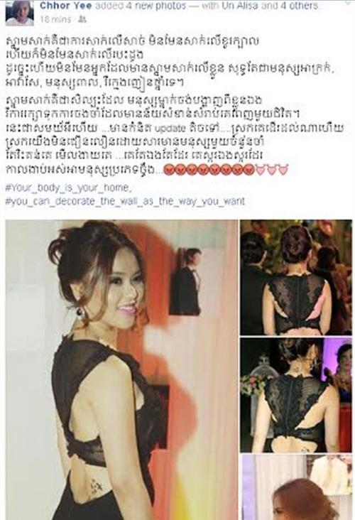 ភ្នំពេញ៖ តារាស្រីដែលទើបតែទទួលបាន កូនស្រីម្នាក់ជាចំណងដៃ ឥតខាន់ស្លា អ្នកនាង ឆយី ហាក់ទទួលរងការរិះ គន់មិនដាច់សោះ ពីមួយទៅមួយ ជាស្ដែងថ្មីៗនេះ នាងក៏បានពើបប្រទះ និងសំឡេងរិះគន់ មួយទៀត ទៅលើស្នាមសាក់លើសាច់ មើលទៅដូចជាជនអាវ៉ាសែ ដែលធ្វើឲ្យតារាស្រីរូបនេះ មានការខឹងសម្បារ ក្រេវក្រោធយ៉ាងខ្លាំង ហើយក៏ប្រញាប់ប្រញាល់ ចេញមុខបកស្រាយ រូបដែលនាងសាក់លើខ្លួន តបទៅអ្នករិះគន់វិញ មិនសំចៃមាត់ឡើយ ។