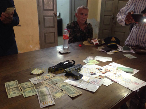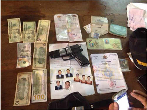 សាក្សីបន្តទៀតថា ក្រោយពីទទួលដំណឹងនេះ ហើយកម្លំាងនគរបាលបានចុះទៅដល់មូលដ្ឋាន រួចក៏បានឃើញជនរូបនេះ សៀតកំាភ្លើងខ្លីនៅចង្កេះ ក្រោយឃាត់ខ្លួនទើបដឹងថា បុរសនោះកាន់កំាភ្លើងជ័រ ហើយនៅក្នុងខ្លួនមានថ្នាំញៀនពីរកញ្ចប់តូច។