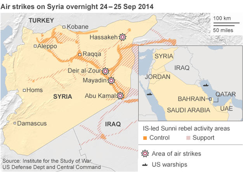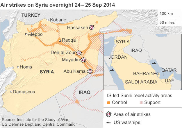 ប្រភពសារព័ត៌មានដដែលបន្តអោយដឹងថា បទអន្តរាគមន៍ វាយប្រហារតាមអាកាសលើកនេះមិនត្រឹមតែមានការវាយប្រហារ ដោយមានការចូលរួម ពីសំណាក់ សហរដ្ឋអាមេរិក តែម្នាក់ឯងនោះទេ តែក៏ មានការចូលរួម ពីសំណាក់យន្តហោះចម្បាំង ប្រទេស សហព័ន្ធអារ៉ាប់អ៊ីម៊ីរ៉េត ដូចគ្នាដែរ ដោយនៅ ក្នុងនោះ គោលដៅវាយប្រហារ ទីតាំង ទាំង ១២ ត្រូវបានគេធ្វើឡើង ក្នុងប្រតិបត្តិការ វាយប្រហារតាម អាកាសក្នុងអំឡុងយប់ថ្ងៃទី ៣ ប្រឆាំងទៅនឹង ក្រុមសកម្មប្រយុទ្ធ ។ គួរបញ្ជាក់ថា ក្រុមឧទ្ទាម IS បាន ធ្វើការគ្រប់គ្រងបាន បណ្តាតំបន់ធំៗមួយចំនួន នៅក្នុងប្រទេស ស៊ីរី និង អ៊ីរ៉ាក់ ក្នុងរយៈពេលប៉ុន្មានខែ ចុងក្រោយនេះ ។