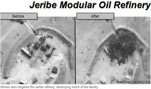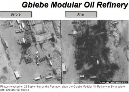 ព័ត៌មានអន្តរជាតិ ៖ យោធាសហរដ្ឋអាមេរិក បានចេញផ្សាយ ខ្សែអាថ៍វីដេអូ ក៏ដូចជារូបថត មូយចំនួន សរបញ្ជាក់អោយឃើញ ពីទិដ្ឋភាពរួម មុន និង ក្រោយ ការវាយប្រហារ តាមអាកាស ទៅលើរោងចក្រ ចម្រាញ់ប្រេង ដែលត្រូវបានគ្រប់គ្រង ដោយក្រុមឧទ្ទាម រដ្ឋអ៊ីស្លាម ជ្រុលនិយម IS នៅឯភាគខាងកើត ប្រទេស ស៊ីរី នេះបើយោងតាមការ ដកស្រង់សម្រង់អត្ថបទផ្សាយ ពីគេហទំព័រសារព័ត៌មានប៊ីប៊ីស៊ី ។