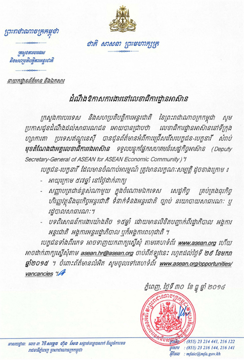 ក្រសួងការបរទេស ប្រកាសអំពី ដំណឹងការងារ នៅលេខាធិការដ្ឋាន អាស៊ាន