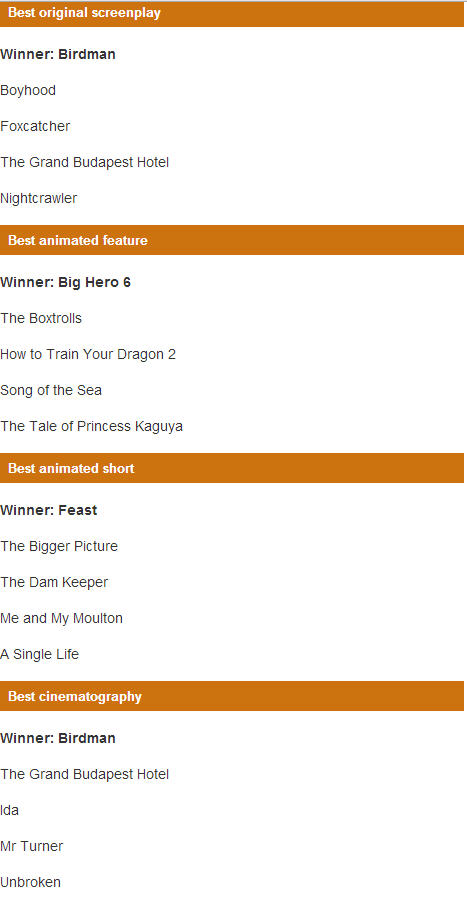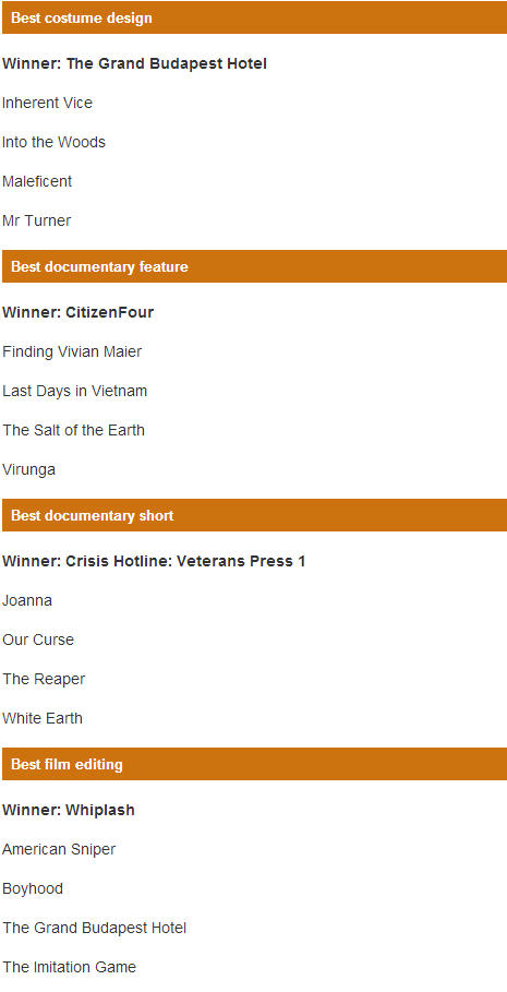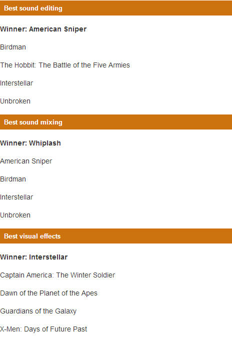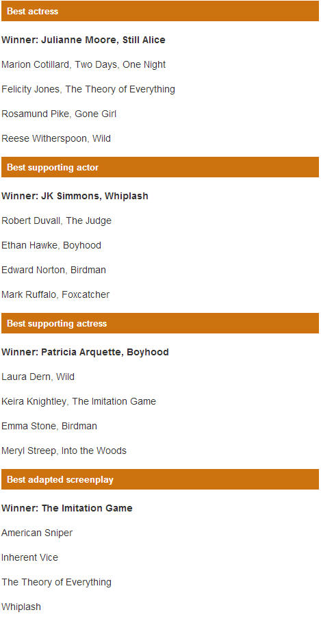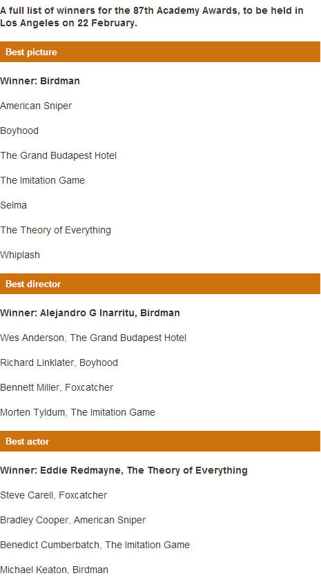 អាម៉េរិក៖ តារាល្បីៗឈ្មោះរបស់ហូលីវូដដែលឈ្នះពានរង្វាន់ Oscar នៃ ព្រឹត្តិការណ៍ប្រចាំឆ្នាំលើកទី៨៧ នៅរដ្ឋ California សហរដ្ឋអាម៉េរិក កាលពីថ្ងៃទី២២ ខែកុម្ភៈ ឆ្នាំ២០១៥កន្លងទៅ ត្រូវបានបង្ហាញឲ្យមហាជន ដឹងជាសាធារណៈ ។ នេះបើតាមការចេញផ្សាយរបស់គេហទំព័រ foxnews នៅថ្ងៃអាទិត្យមិ្សលមិញ ។