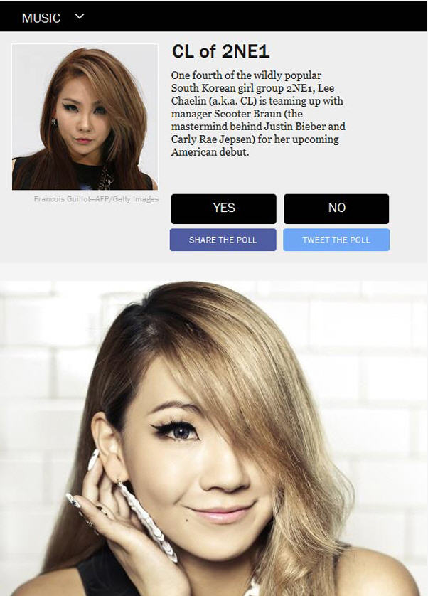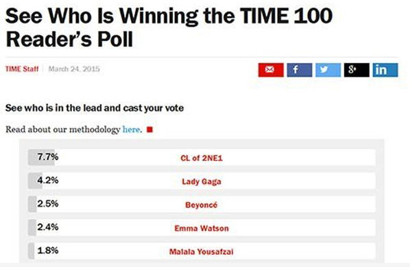 ព័ត៌មានពី Allkpop និង YG បានឲ្យដឹងដូចគ្នា នៅថ្ងៃទី២៦ខែមីនាឆ្នាំ២០១៥នេះថា Time 100 បានធ្វើបោះឆ្នោតជ្រើសរើស មនុស្សដែលមានឥទ្ធិពលបំផុត លើលោក ក្នុងនោះ មេក្រុម 2NE1 តារាសម្រៀងដ៏ល្បីល្បាញ CL ដែលមានឈ្មោះពេញ Lee Chaelin ឈរនៅលំដាប់ខ្ពស់ បំផុត ក្នុងចំណោមតារាទាំង១០០នាក់ ដែលទស្សនាវដ្តី អាមេរិកTIME បានធ្វើការជ្រើសរើស ដែលនាង បានលទ្ធផលរហូតដល់ 8.7 ភាគរយ ពីការបោះឆ្នោតគាំទ្រ ខណៈតារាល្បីៗផ្សេងទៀត ដូចជា Lady Gaga បានត្រឹមតែ 4.1 ភាគរយ និងបន្តបន្ទាប់ទៀត មាន Beyoncé, Rihanna, Taylor Swift, និង Emma Watson, ។