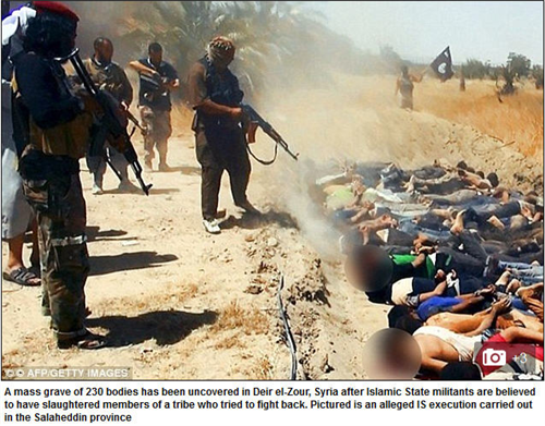 ព័ត៌មានអន្តរជាតិ ៖ សាកសពមនុស្សច្រើនជាង ២៣០ នាក់ ត្រូវបានគេជឿថា សម្លាប់ចោលដោយក្រុម ឧទ្ទាមរដ្ឋអ៊ីស្លាមជ្រុលនិយម Islamic State (IS) នោះ ត្រូវ បាន ប្រទះឃើញនៅក្នុងផ្នូរដ៏ធំមួយ នៅភាគ ខាងកើតប្រទេស ស៊ីរ៊ី នេះបើតាមការអះអាងអោយដឹង ពីក្រុមសកម្មជន ។