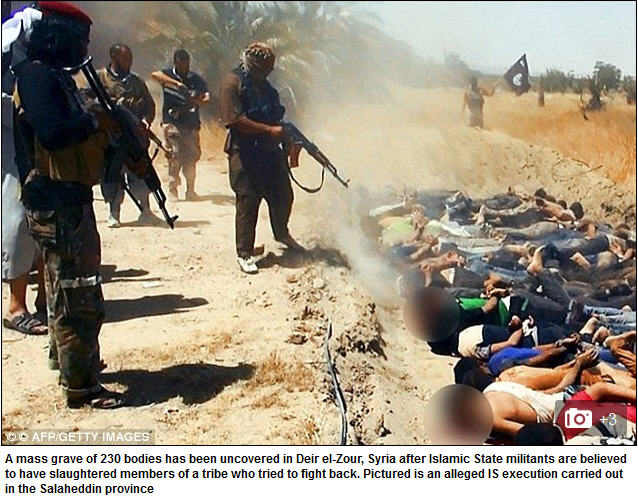 សាក្សីរស់ម្នាក់ និយាយអោយដឹងថា គាត់បានឃើញក្បាលមនុស្សជាច្រើន ចងភ្ជួរទៅនឹងជញ្ជាំង ខណៈ នោះខ្ញុំ និងគ្រួសាររបស់ខ្ញុំ ខំប្រឹងរត់គេចខ្លួនទាំងប្រថុយប្រថាន មិនត្រឹមតែ ប៉ុណ្ណោះ ផ្នូរថ្មីៗ ត្រូវបានគេ ជីកជាបន្តបន្ទាប់ ។ គួររំឮកថា វីដេអូដែលមានការបង្ហោះឡើងជាសាធារណៈ កាលពីពេលកន្លងទៅនេះ សរបញ្ជាក់អោយដឹងថា ក្រុមរដ្ឋអ៊ីស្លាម IS បានចាប់ប្រតិបត្តិការ សម្លាប់ កាត់ ក្បាល ក្នុងទ្រង់ទ្រាយធំ ប្រឆាំងទៅនឹងក្រុមកុលសម្ព័ន្ធ Sheitat ដែលប្រឆាំងនឹងក្រុមខ្លួន ៕