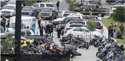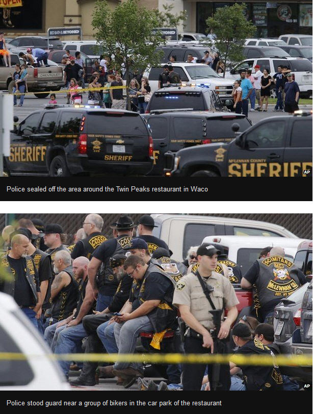 សេចក្តីរាយការណ៍ បន្តអោយដឹងថា ហេតុការណ៍គ្រោះថ្នាក់ ឈានដល់សម្លាប់មនុស្សលើកនេះ បាន កើតឡើងនៅឯ ភោជនីយដ្ឋាន Twin Peaks Sports Bar and Grill នៅឯតំបន់ ផ្សារ ទំនើប ដែលត្រូវ បានគេស្គាល់ឈ្មោះថា Central Texas Market Place ។ មន្រ្តីប៉ូលីស ប្រចាំតំបន់កើត ហេតុអោយដឹង ថា មនុស្ស ៨ នាក់ បានស្លាប់បាត់បង់ជីវិត នៅនឹងកន្លែង ខណៈ ជនរងគ្រោះស្លាប់ទី ៩បានស្លាប់បាត់ បង់ជីវិត នៅឯមន្ទីរពេទ្យ ក្នុងនោះ ១៨ នាក់ផ្សេងទៀត រងរបួស ធ្ងន់ និង ស្រាលគួរបញ្ជាក់ថាទាំងជន រងគ្រោះស្លាប់ និង របួស ទាំងអស់គ្នា គឺជា ក្រុមអ្នកជិះម៉ូតូធំ ។