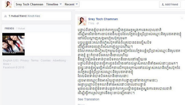 សូមបញ្ជាក់ថា កាលពីថ្ងៃទី៨ ខែមេសា ឆ្នាំ២០១៥ នេះ លោកស្រី ម៉ៅ ចំណាន ហៅ ស្រីតូច ចំណាន បានដាក់ពាក្យ ប្ដឹងទៅកាន់ លោក នេត សាវឿន អគ្គស្នងការនគរបាលជាតិ ចំពោះអ្នកបន្លំឈ្មោះ Account Facebook របស់លោក ស្រី ដើម្បីចាត់ការតាមផ្លូវច្បាប់ ប៉ុន្តែរហូតមកដល់ពេលនេះ គេនៅមិនទាន់ដឹងថា ពាក្យបណ្ដឹងនោះ មានចំណាត់ការ ដល់ណានោះទេ ។ ទោះជាយ៉ាងណា តាមរយៈសារព្រមានជាថ្មីនេះ អាចបញ្ជាក់បានថា ជនខិលខូច ពិតជាមាន ចេតនាគេចវេចពីសំណាញ់ច្បាប់ បានជាមាន Account Facebook ខ្លះដែលបន្លំឈ្មោះនោះត្រូវបានបិទ ៕