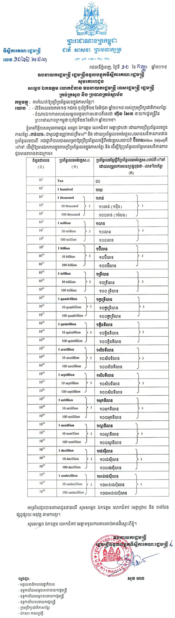 ឧបនាយករដ្ឋមន្រ្តី រដ្ឋមន្រ្តីទទួលបន្ទុកទីស្តីការគណៈរដ្ឋមន្រ្តី លោក សុខ អាន នៅក្នុងសេចក្តីណែនាំផ្ញើរជូនមន្រ្តី រាជការតាមក្រសួងស្ថានប័ននានា កាលពីថ្ងៃទី១០ ខែកញ្ញា ឆ្នាំ២០១៥ ដែលមជ្ឈមណ្ឌលព័ត៌មានដើមអម្ពិល ទើប ទទួលបាននៅថ្ងៃទី១៤ ខែកញ្ញា ឆ្នាំ២០១៥នេះ បានបញ្ជាក់ថា ការកំណត់ឲ្យប្រើប្រព័ន្ធលេខខ្មែរតាមស្តង់ដារបស់ អង់គ្លេសចាប់ពីលេខ ១០ ស្វ័យគុណ៩ នេះ ដោយសារតែការប្រើប្រព័ន្ធលេខក្នុងភាសាខ្មែរជាមូលដ្ឋាន ត្រូវទាល់ ត្រឹម ១០ ស្វ័យគុណ ១២ និងដោយសារប្រព័ន្ធលេខអង់គ្លេស មានភាពច្បាស់លាស់ (សនិទានភាព) ជាងប្រព័ន្ធ លេខបាលី។