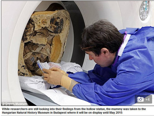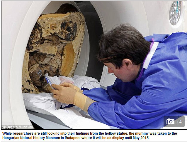 គួររំឮកថា សំណល់ក្រដាស គ្របដណ្តប់ សាកសព ដោយសរសេរអក្សរចិន ត្រូវបានគេរកឃើញ នៅក្បែរ ព្រះសង្ឃ បន្ទាប់ពីការស្កេននេះ សាកសព ត្រូវបានក្រុមអ្នកស្រាវជ្រាវ នាំ ទៅ ទីក្រុង Budapest ដែលជា កន្លែង ត្រូវបានដាក់តាំងបង្ហាញ នៅឯសារមន្ទីរប្រវត្តិសាស្រ្ត ធម្មជាតិហុងគ្រី ( Hungarian Natural History Museum) រហូតមកដល់ខែឧសភា ឆ្នាំ ២០១៥ ។