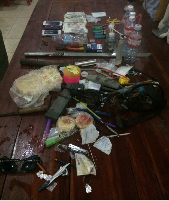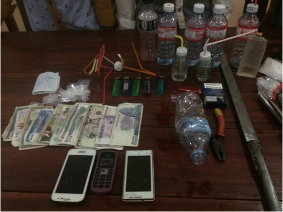 តាមមន្ដ្រីអាវុធហត្ថ វត្ថុតាងដែលត្រូវដក ហូតក្នុងប្រតិបត្ដិការខាងលើនេះរួមមាន ក្បាលមាន់ផ្សាមួយ កាតាប១ ទុយោច្នៃរួច ១៣ ដែកកេះ ៦ ពូថៅ ១ សំបកថង់សម្រាប់ ច្រកថ្នាំ ៦៦ ដាវវែង ១ រណាអារដែក១ និង ថវិកាមួយចំនួនទៀត ។