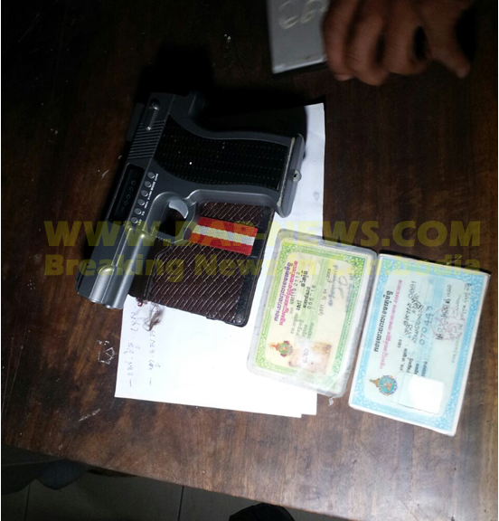 ក្រោយមកទើប មានបុរសម្នាក់ឈ្មោះ សៅ វិទូ ត្រូវជាមិត្តភក្តិ របស់អាខ្មៅ ចូលទៅជួយឃាត់ខ្លួន បណ្តាលឲ្យជ្រុះ កាំភ្លើងខ្លី១ដើម ទើបធ្វើឲ្យអ្នកមើលហេតុការណ៍នោះ នាំគ្នារត់គេចខ្លួន រហូតសភាពការណ៍ ស្ងប់ស្ងាត់ ទើបនាំគ្នាមកពិនិត្យ មើលទើបដឹងថា ជាកាំភ្លើងជ័រ ចំណែកឯ ឈ្មោះខ្មៅ គេចខ្លួនបាត់ ទើបអ្នកជិត ខាងបានទូរស័ព្ទទៅប្តឹងឲ្យ នគរបាលចុះមកអន្តរាគមន៍ និងឃាត់ខ្លួន បានបុរសកាំភ្លើងជ័រ ។