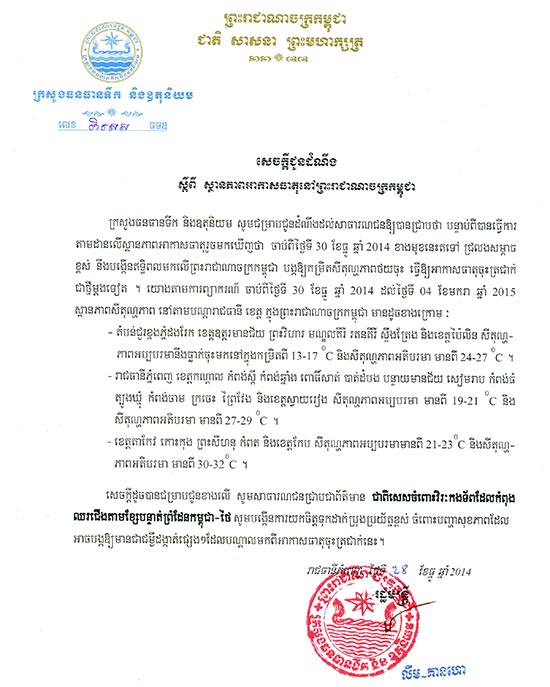 យោងតាមលិខិតជូនដំណឹងរបស់ក្រសួងធនធានទឹកនៅថ្ងៃទី២៨ ខែធ្នូ ឆ្នាំ២០១៤ បានឲ្យដឹងថា សីតុណ្ហភាព នឹងចាប់ផ្តើមចុះត្រជាក់ ចាប់ពីថ្ងៃទី៣០ ខែធ្នូ ឆ្នាំ២០១៤ ដល់ថ្ងៃទី០៤ ខែមករា ឆ្នាំ២០១៥។