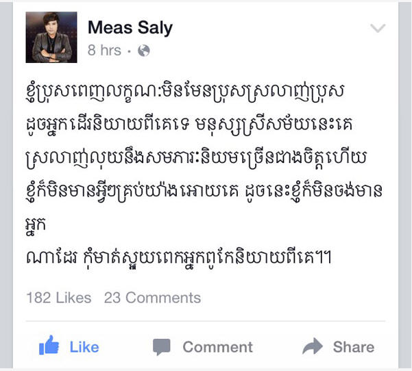 ដោយអន់ចិត្តពេក តារាចម្រៀង មាស សាលី ក៏និយាយក្នុង Facebook ថា «លោកជាប្រុសពេញលក្ខណៈ មិនមែនប្រុសស្រឡាញ់ប្រុស ដូចអ្នកដើរនិយាយដើមគេទេ មនុស្សស្រីសម័យនេះ គេស្រឡាញ់លុយនឹងសម្ភារនិយមច្រើនជាងចិត្ត ហើយខ្ញុំមិនមានអ្វីគ្រប់យ៉ាងឲ្យគេ ដូចនេះខ្ញុំក៏មិនចង់មានអ្នកណាដែរ កុំមាត់ស្អុយពេក អ្នកនិយាយពីគេ..» ។