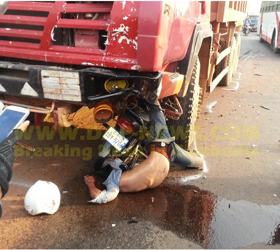 កណ្ដាល ៖ យុវជនម្នាក់ បានបើកម៉ូតូយ៉ាង លឿន ស្រាប់តែទៅបុកគាបជាប់រថយន្ដ ក្រុមហ៊ុនចិនដឹកដីធ្វើផ្លូវជាតិលេខ៥ បណ្ដាល ឱ្យស្លាប់ភ្លាមៗនៅនឹងកន្លែងកើតហេតុ កាលពី ល្ងាចថ្ងៃទី០១ ខែមករា ឆ្នាំ២០១៥ ស្ថិតនៅ ចន្លោះគីឡូម៉ែត្រលេខ២៧-២៨ ភូមិទួល អំពិល ឃុំពញាឮ ស្រុកពញាឮ ខេត្ដកណ្ដាល។