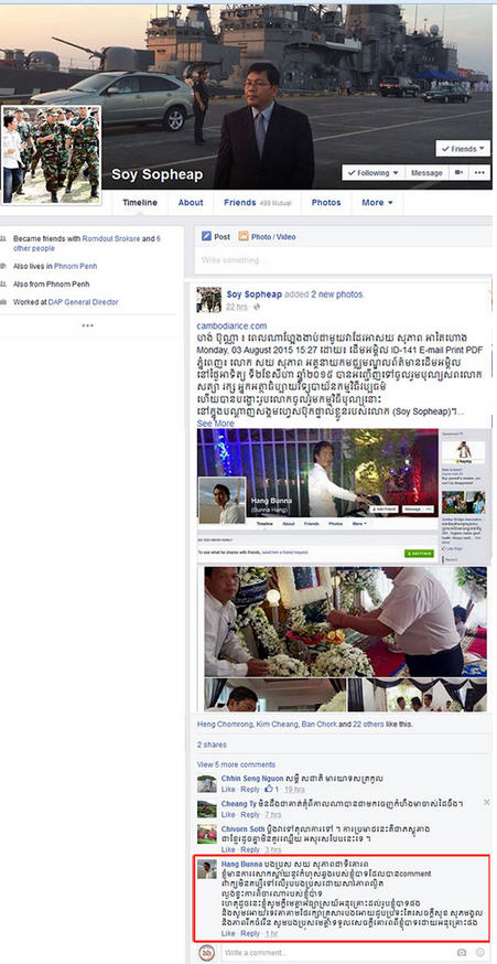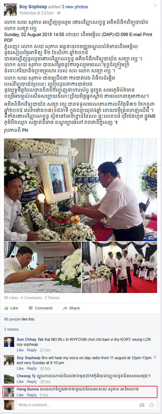 ប្លែកអី តែលោក ហង់ ប៊ុណ្ណា ដែលគ្រាន់តែជា មិត្តភក្តិ (Friend) តាមបណ្តាញសង្គមហ្វេសប៊ុក មិនដែលទាំង ស្គាល់មុខគ្នាជាមួយលោក សយ សុភាពផងនោះ ហាក់មានកំហឹង និងខឹងសម្បាខ្លាំង បានចេញមក Comment ជេរបញ្ចោ និងប្រមាថដល់អាយុជីវិតរបស់លោក សយ សុភាព យ៉ងអសុរោះជាទីបំផុត។