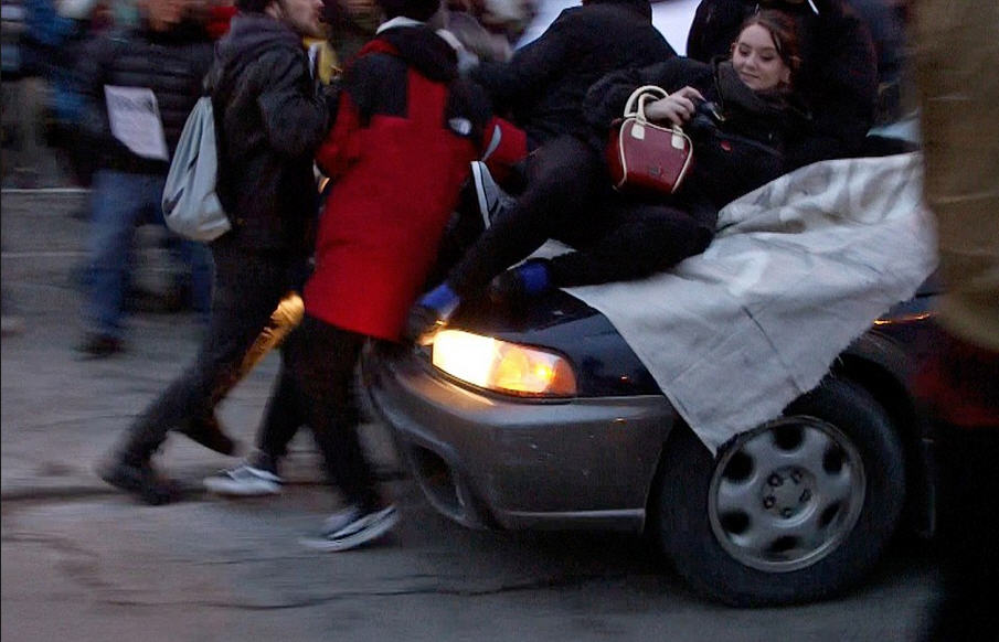 តាមរយៈខ្សែអាថ៍វីដេអូ ភ្លាមៗនោះ ក្រោយពីសំចតបានប៉ុន្មានវិនាទី រថយន្តក៏បន្តដំណើរទៅមុខដោយ បោលបុកហ្វូងបាតុករ ក្នុងល្បឿនមួយយឺតៗ ។ យ៉ាងហោចណាស់ បាតុករមួយរូប ត្រូវបានគេធ្វើសេច ក្តីរាយការណ៍អោយដឹងថា ត្រូវបានរថយន្តកិនពីលើ ។ វិនាទីនោះ រថយន្ត ក៏ឈប់ ខណៈហ្វូងបាតុករ បានទៅរោមនិងឡោមព័ន្ធរថយន្តខាងលើ ។ របាយការណ៍បញ្ជាក់ថា មានវិនាទីមួយនេះ អ្នកបើកបរ រថយន្តបានចុះពីលើរថយន្ត វាយបាតុករ រួចបើករថយន្តគេចខ្លួនបាត់ ។