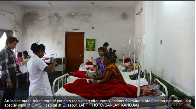 ទំព័រសារព័ត៌មានសឹង្ហបុរី channelnewsasia ចេញ ផ្សាយ វេលា ល្ងាចថ្ងៃអង្គារ ទី២ ធ្នូ ម្សិលមិញនេះ អោយដឹងថា ស្រ្តីទាំងនោះ បានស្លាប់ បាត់បង់ ជីវិត បន្ទាប់ពីទទួលការវះកាត់ កាត់ដៃស្បូន នៅឯជុំរុំ ក្នុងរដ្ឋ Chhattisgarh កាលពីអំឡុង ខែ កន្លងទៅនេះ ក្នុងនោះ មិនត្រឹមតែបណ្តាលអោយស្រ្តីជាច្រើន នាក់ស្លាប់បាត់បង់ជីវិតតែប៉ុណ្ណោះទេ តែ ក៏ បានបណ្តាលអោយ ស្រ្តីជាច្រើនផ្សេងទៀតរងរបួសដេក ពេទ្យដូចគ្នាដែរ រហូតញ៉ាំងអោយមានសម្លេងរិះគន់ ពាក់ព័ន្ធនឹង កម្មវិធីផែនការគ្រួសារ របស់ប្រទេស ឥណ្ឌាមួយនេះ ។