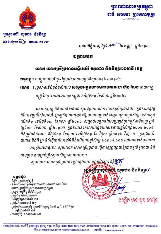 ភ្នំពេញ៖ ថ្ងៃបើកបវេសនាកាលសម្រាប់ឆ្នាំសិក្សា ២០១៤-២០១៥នេះ មិនបានប្រព្រឹត្តទៅនៅថ្ងៃទី០១ ខែតុលា ដូចបណ្តាឆ្នាំកន្លងទៅនោះទេ គឺត្រូវលើកទៅធ្វើនៅថ្ងៃទី០១ ខែវិច្ឆិកា ជំនួសវិញ។