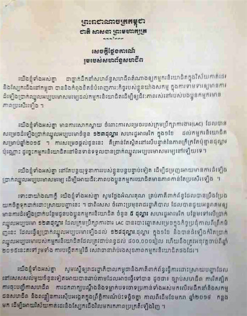 សហជីពដដែល ក៏បានអំពាវនាវដល់អ្នកបញ្ជាទិញ វិលត្រឡប់មកដាក់បញ្ជាទិញពីកម្ពុជា ឱ្យបានកាន់តែច្រើនតាមការសន្យារបស់ខ្លួន ដើម្បីលើកទឹកចិត្តនិង ជំរុញឱ្យមានការដំឡើង ប្រាក់ឈ្នួលអប្បបរមានៅកម្ពុជា ឱ្យកាន់តែភាពសមរម្យនិងប្រសើរឡើង៕
