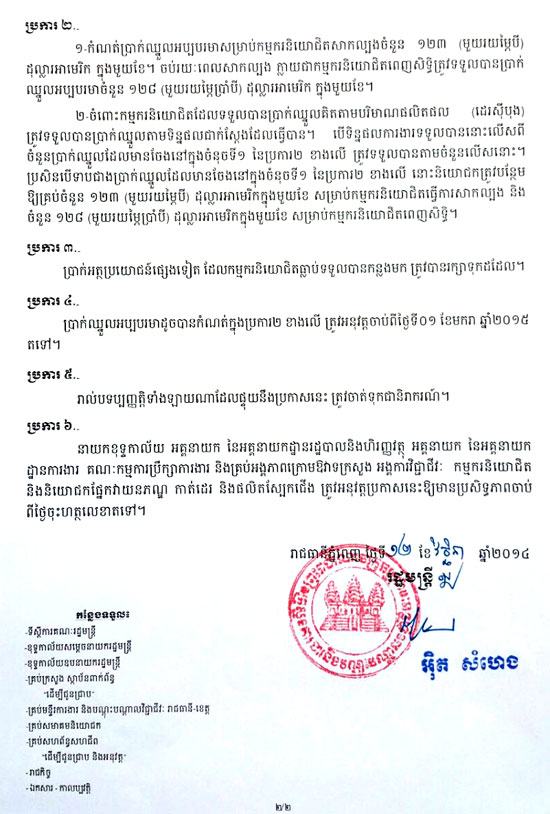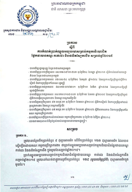 យោងតាមសេចក្តីប្រកាស ព័ត៌មានរបស់ក្រសួងការងារ ចុះហត្ថលេខាដោយលោក អ៊ិត សំហេង ឱ្យដឹង នៅថ្ងៃ ពុធ ទី១២ ខែវិច្ឆិកា ឆ្នាំ២០១៤ថា ប្រមុខរាជ រដ្ឋាភិបាលកម្ពុជាសម្តេចតេជោ ហ៊ុន សែន សម្រេច ដំឡើងប្រាក់ឈ្នួលអប្បបរមាសម្រាប់ក្រុមកម្មករវិស័យកាត់ដេរ និងផលិតស្បែកជើង នៅឆ្នាំ២០១៥ ខាងមុខ ចំនួន១២៨ដុល្លារ បន្ទាប់ពីភាគីពាក់ព័ន្ធបានស្នើសុំ។ ប្រភពដដែលបន្តថា “ទឹកប្រាក់ ចំនួន៥ដុល្លារ ត្រូវបានបន្ថែមលើទឹកប្រាក់ចំនួន ១២៣ដុល្លារ ដែលបាន ស្នើឡើង ដោយគណៈកម្មកាប្រឹក្សាការងារ ជាប្រាក់ឈ្នួលអប្បបរមាសម្រាប់កម្មករ និយោជិតផ្នែក វាយនភណ្ឌកាត់ដេរ និងផលិតស្បែកជើងក្នុងមួយខែ ដែលសរុបទាំង អស់១២៨ដុល្លារ”។