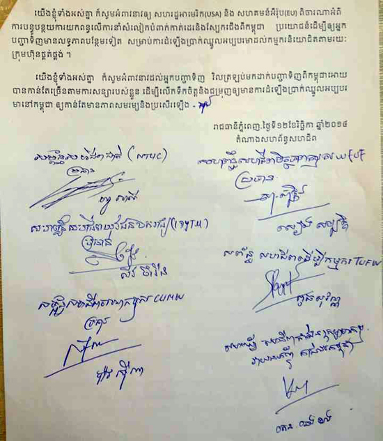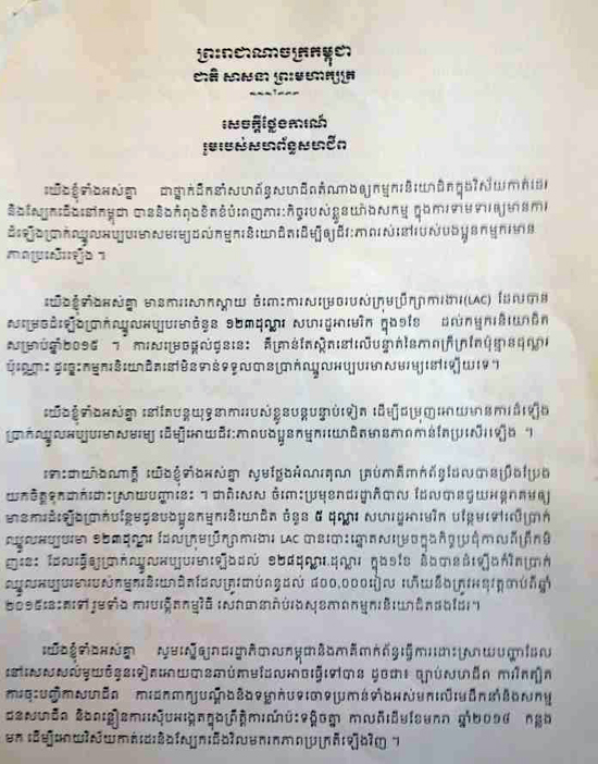 សេចក្តីថ្លែងការណ៍របស់ក្រុមសហជីពទាំង៨ ក៏បានថ្លែងអំណរគុណគ្រប់ភាគីពាក់ព័ន្ធ ដែលបាន ប្រឹងប្រែងយកចិត្តទុកដាក់ដោះស្រាយបញ្ហានេះ “ជាពិសេសប្រមុខ រាជរដ្ឋាភិបាល (សម្តេចតេជោ ហ៊ុន សែន)” ដែលបានជួយអន្តរាគមន៍ ឲ្យមានការដំឡើងប្រាក់បន្ថែម ជូនកម្មករបន្ថែមទៅលើ ប្រាក់អប្បបរមា៥ដុល្លារ ដែលក្រុមប្រឹក្សាការងារបានបោះឆ្នោត សម្រេចក្នុងកិច្ចប្រជុំ ដែលធ្វើឲ្យប្រាក់ ឈ្នួលអប្បបរមាឡើងដល់១២៣ដុល្លារក្នុងមួយខែនិងបានដំឡើង កំរិតប្រាក់ឈ្នួល អប្បបរមា របស់កម្មករ និយោជិត ដែលត្រូវ ជាប់ពន្ធដល់៨០០.០០០រៀល ហើយនឹងត្រូវអនុវត្តចាប់ ពីឆ្នាំ២០១៥ រួមទាំងការ បង្កើតកម្មវិធីសេវាធានារ៉ាប់រង សុខភាពកម្មករនិយោជិតផងដែរ។ សហជីពទាំងអស់ស្នើឲ្យរាជរដ្ឋាភិបាលកម្ពុជា និងភាគីពាក់ព័ន្ធធ្វើ ការដោះស្រាយ បញ្ហាដែល នៅសេសសល់មួយចំនួនទៀត ឲ្យបានឆាប់រហ័សតាមដែលអាចធ្វើទៅបានដូចជា ច្បាប់សហជីព ការរិតត្បិត ការចុះបញ្ជិលកាសហជីព ការដកពាក្យបណ្តឹង និងទម្លាក់ បទចោទ ប្រកាន់ទាំង អស់មក លើមេសហជីពនិងសកម្មជនសហជីព និងពន្លឿនការស៊ើបអង្កេតក្នុង ព្រឹត្តិការណ៍ប៉ះទង្គិចគ្នា កាលពី ដើមខែមករាឆ្នាំ២០១៤ ឲ្យដើម្បីឲ្យវិស័យកាត់ដេរ និងស្បែកជើងវិលមករកភាពប្រក្រតីឡើងវិញ.។