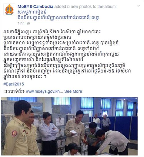 Facebook Page បានឲ្យដឹងថា «នាព្រឹកថ្ងៃទី២១ ខែសីហា ឆ្នាំ២០១៥នេះ ប្រធានគណៈមេប្រយោគទូទាំងប្រទេស ប្រធានគណៈអប្បមាទ ទូទាំងប្រទេសប្រចាំរាជធានី-ខេត្ត បានរៀបចំ និងដឹកជញ្ជូនហឹបវិញ្ញាសា ទៅកាន់រាជធានី-ខេត្តទាំង២៥ ដោយមានការចូលរួម សង្កេតការណ៍ពីអង្គភាពប្រឆាំងអំពើពុករលួយ អ្នកសង្កេតការណ៍ និងដៃគូអភិវឌ្ឍន៍វិស័យអប់រំ ដើម្បីត្រៀមសម្រាប់ដំណើរការ ប្រឡងសញ្ញាបត្រមធ្យមសិក្សាទុតិយភូមិ ចំណេះទូទៅ និងបំពេញវិជ្ជា ដែលនឹងប្រព្រឹត្តទៅនៅថ្ងៃទី២៤-២៥ ខែសីហា ឆ្នាំ២០១៥ ខាងមុខនេះ»។